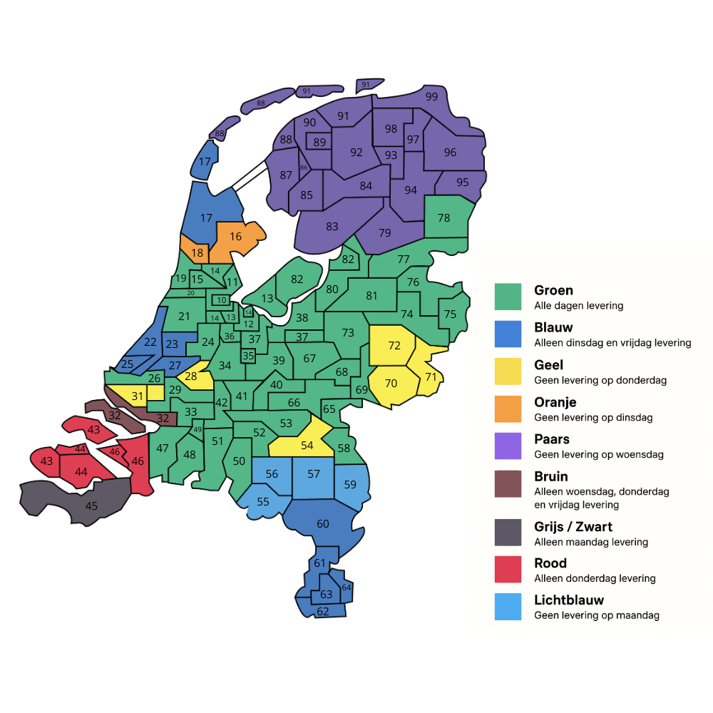 Op de kaart ziet u onze leveringsroutes per postcodegebied. Zo weet u precies op welke dag we bij u in de regio leveren. Zoek uw postcode op en kijk op de kaart voor de bijbehorende leveringsdag. Heeft u vragen over een postcode of levering? Neem contact met ons op – we helpen u graag!