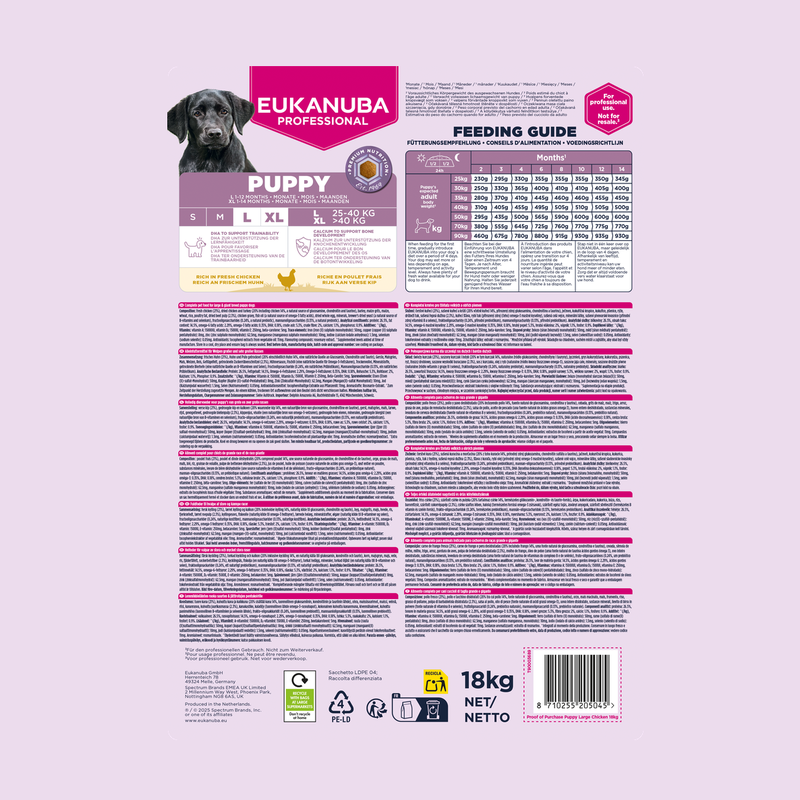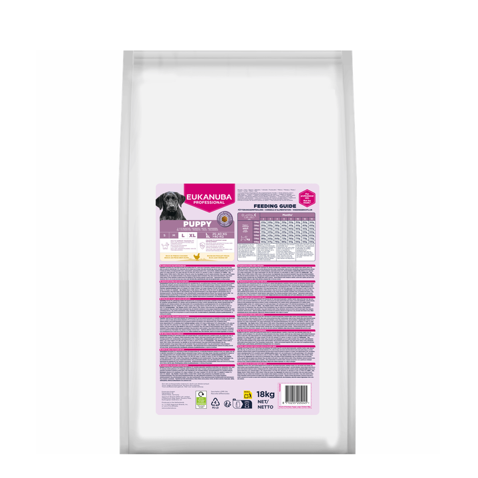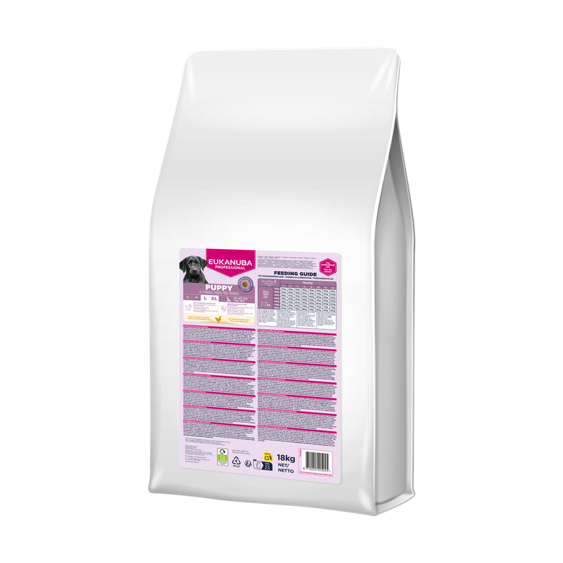 Dit EUKANUBA droog hondenvoer is speciaal samengesteld voor puppy's van grote rassen van 1 tot 12 maanden (of 1 tot 14 maanden voor zeer grote rassen). Het is rijk aan verse kip en bevat zorgvuldig geselecteerde ingrediënten om op maat gemaakte voeding te bieden voor optimale groei en ontwikkeling. Het recept met DHA ondersteunt het leervermogen en de trainbaarheid tijdens de eerste maanden van uw puppy, terwijl het aanwezige calcium zorgt voor de ontwikkeling van sterke botten en een gezonde skeletstructuur. Vertrouw op EUKANUBA om de basis te leggen voor een gelukkig en gezond leven van uw hond.