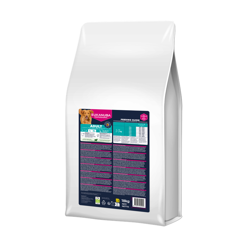 Dit EUKANUBA droogvoer is speciaal samengesteld voor grote volwassen honden van 18 maanden tot 6 jaar (2 tot 5 jaar voor zeer grote honden). Het is rijk aan lamsvlees en rijst, en bevat zorgvuldig geselecteerde ingrediënten om op maat gemaakte voeding te bieden voor een optimaal welzijn van uw hond. Het voer is zelfs geschikt voor honden met een gevoelige maag, omdat de rijst licht verteerbaar is. De kip biedt een extra bron van eiwitten, naast het lamsvlees, wat helpt bij het creëren van sterke, soepele spieren. De toevoeging van L-carnitine helpt bij het vetmetabolisme, waardoor uw hond een optimaal gewicht behoudt en zijn gewrichten minder belast worden. Een aangepaste vezelmix met prebiotische FOS en bietenpulp zorgt voor een gezonde spijsvertering, zodat uw hond actief, gezond en gelukkig blijft.