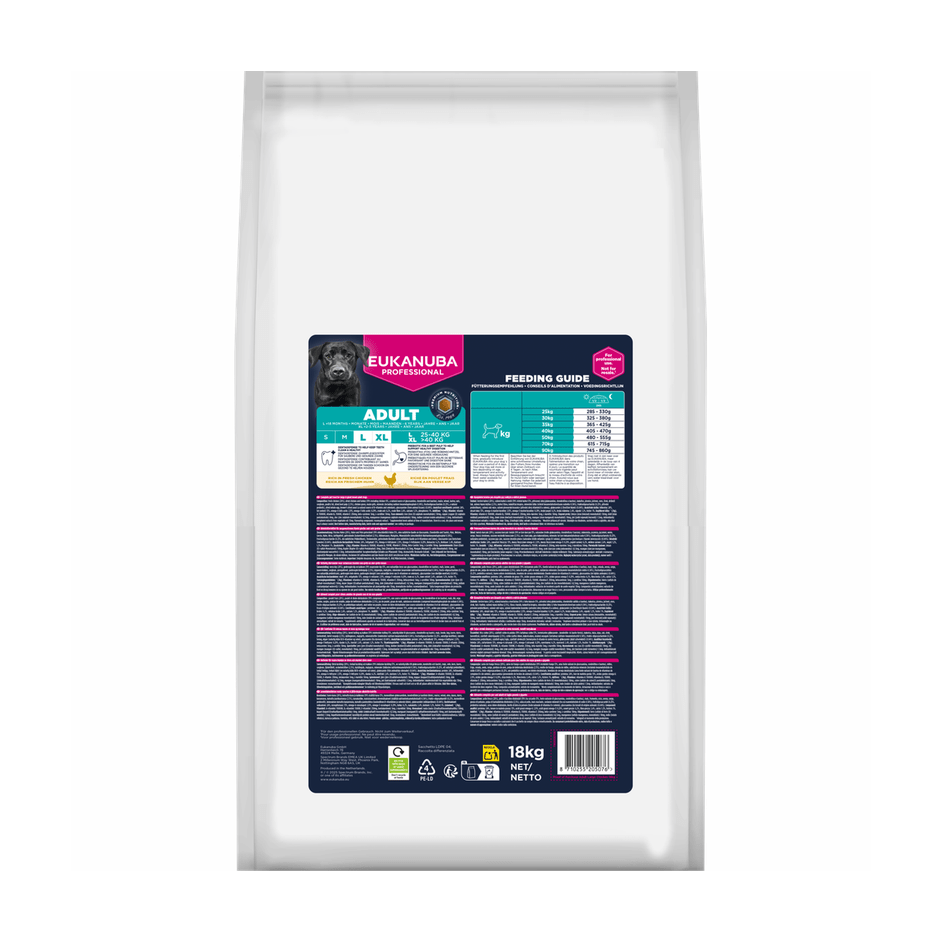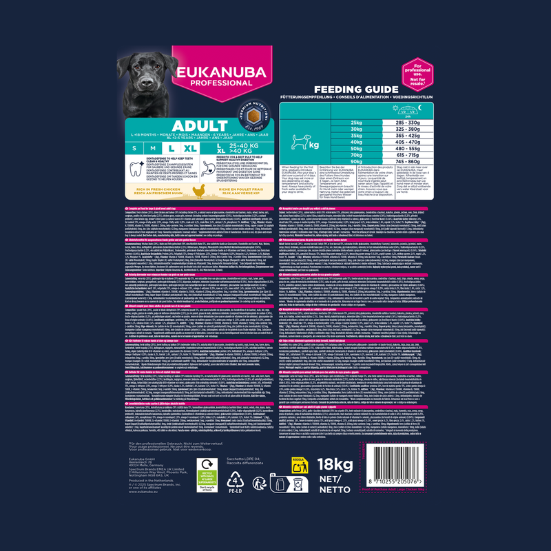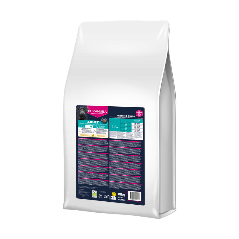 Dit EUKANUBA droogvoer is speciaal samengesteld voor grote volwassen honden van 18 maanden tot 6 jaar (2 tot 5 jaar voor zeer grote rassen). Het is rijk aan verse kip en bevat zorgvuldig geselecteerde ingrediënten om op maat gemaakte voeding te bieden voor een optimaal welzijn van uw hond. De toevoeging van L-carnitine helpt bij het vetmetabolisme, waardoor uw hond een optimaal gewicht behoudt en zijn gewrichten minder belast worden. Een aangepaste vezelmix met prebiotische FOS en bietenpulp zorgt voor een gezonde spijsvertering, zodat uw hond actief, gezond en gelukkig blijft.